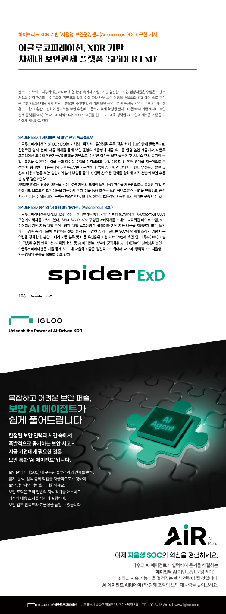 이글루코퍼레이션이 초자동화 시대의 금융, 전자, 제조 기업에 부합하는 보안 관리 패러다임을 제시합니다. 차세대 SIEM(보안 정보 및 이벤트 관리)과 SOAR(보안 운영·위협 대응 자동화) 기반의 ‘지능형 보안 자동 대응 체계’ 구현을 통해, 보안 운영 및 위협 대응 업무의 효율성을 극대화하길 바랍니다.